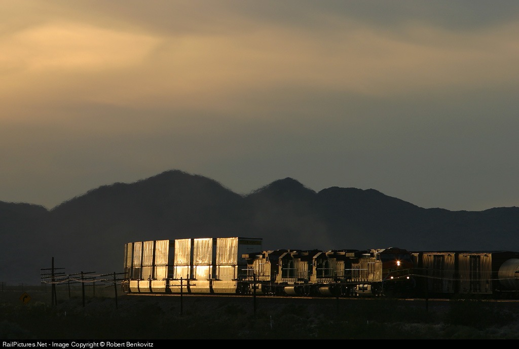 | An eastbound stack train heading for Needles passes a slow-moving merch heading upgrade towards Barstow. Canon EOS 10D, 250@f6.7, 300mm |