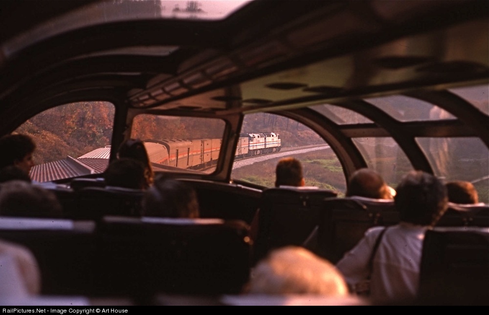 The view from the dome: the eastbound Amtrak Capitol Limited descends Sand Patch Grade on a bright fall morning in 1985. Up front are a pair of Amtrak F40PH diesels.
