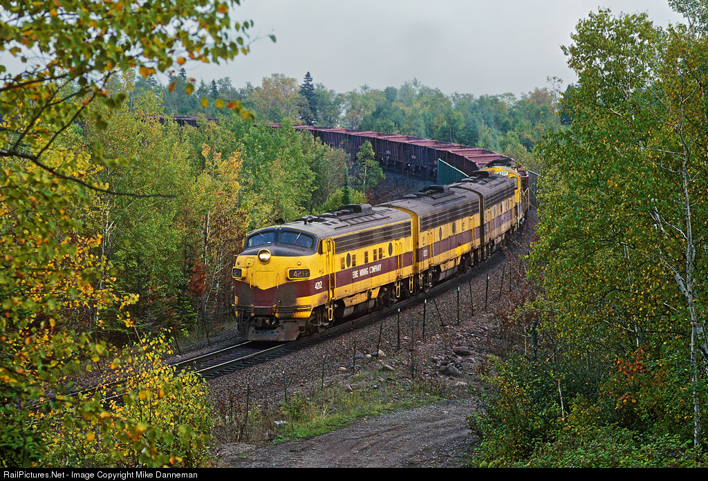 As the rear of a LTV Mining (former Erie Mining) ore train slowly rumbles over the dock at Taconite Harbor still dumping taconite pellets, in this view, the power curves away from the dock and lake, at Taconite Harbor, Minnesota, on September 24, 1994. The train is led by venerable EMD F9A No. 4212.