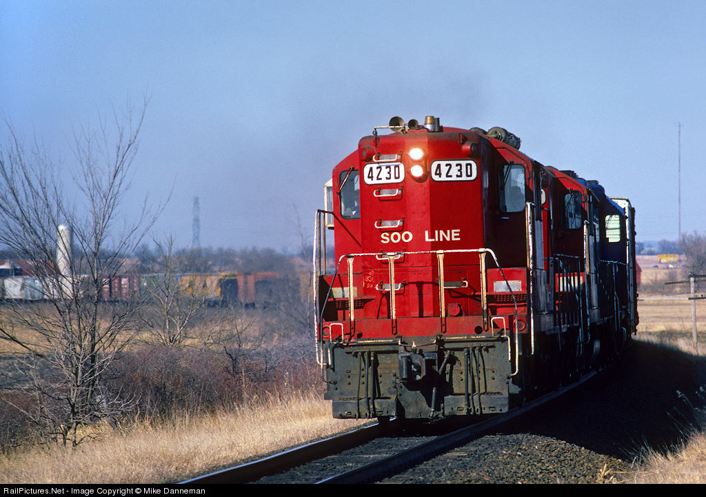 Storming up Byron Hill, south of Fond du Lac, Wisconsin, a Soo Line freight attacks the grade on March 22, 1987. This was in the colorful Lake States era on this portion of the original Soo Line, with this train rating two Soo GP9s and a leased Conrail GP35.