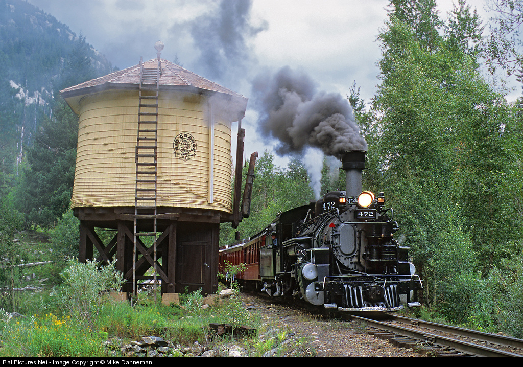 Durango & Silverton’s Presidential special is operated during the late summer Railfest activities. For the 2005 version, the railroad renumbered Mikado 478 to a long-scrapped sister engine, No. 472, that was sent to Alaska during WWII and then dismantled after the war. In this view, the westbound (northbound) train is stopped at the recently restored Needleton tank on its trip to Silverton on August 27.