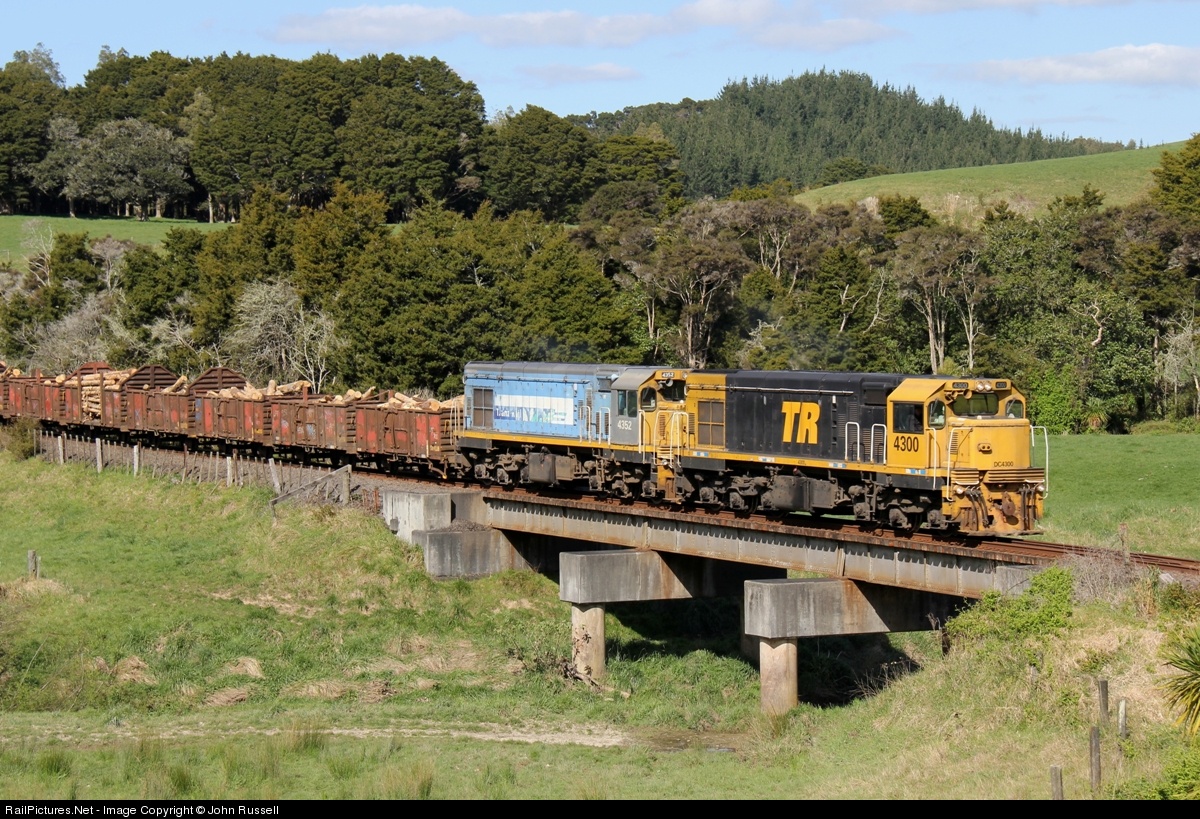 Trains on 3' 6" (1.067m) track from Whangarei to Bluff with virtually heritage rebuilt EMD and GE locomotives still the mainstay power. The network was privatized in 1990's and operated by Toll until 2008 when state owned KiwiRail was established.