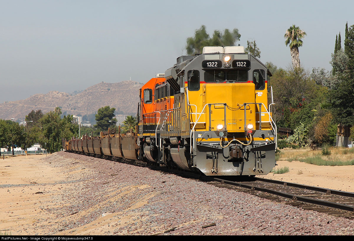 | Nearing the Mt Vernon Ave crossing on the San Jacinto Branch, former PRLX 3004 now lettered for BNSF, 1322 leads this baretable move as it crawls up grade towards Box Springs. |