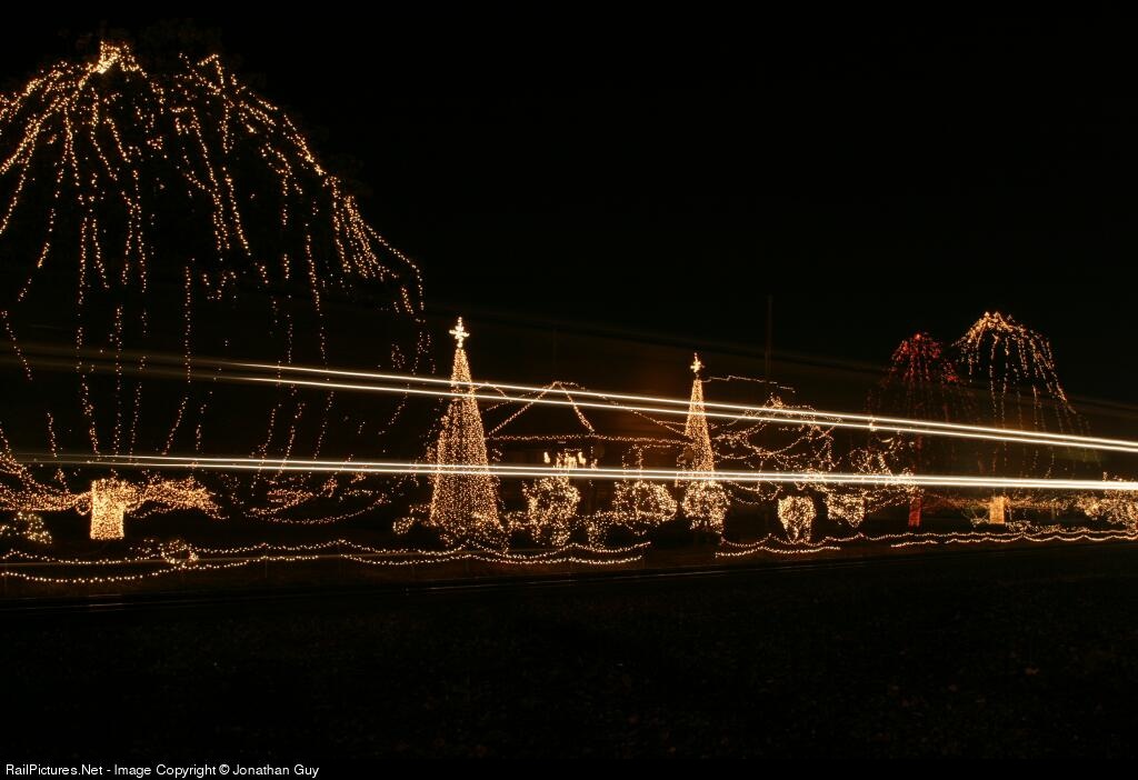 Empty Sherer coal drag passes the Austell Gazeebo and holiday light display.