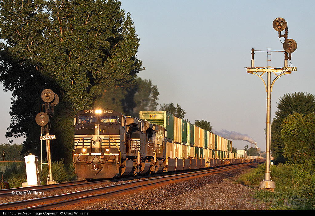 | Eastbound NS intermodal train rolls thru small town of Pettisville along the busy Chicago to Cleveland main. Along this ex-NYC route, there is still signs of the previous owner with the signal system. |