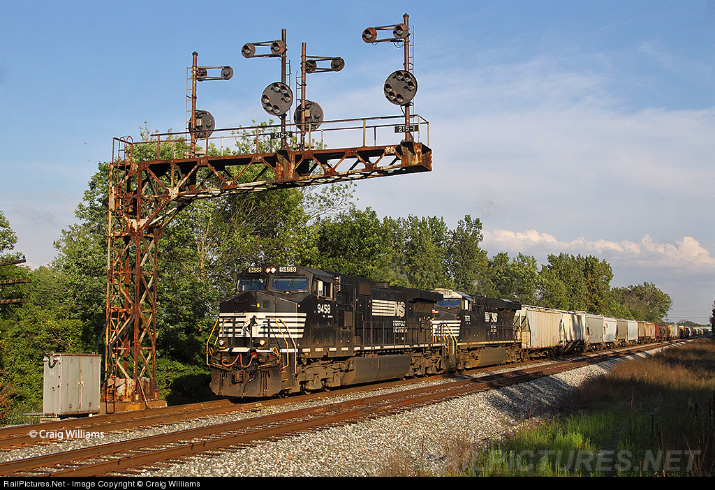 | A northbound NS train passes the ex-B&O signals here at MP 21, a place called Wayne Yard. Between Cincinnati and Hamilton NS and CSXT use each other's mainlines as directional running. This CSXT side is mainly for northbound trains which NS uses to reach their New Castle District north of Hamilton. |