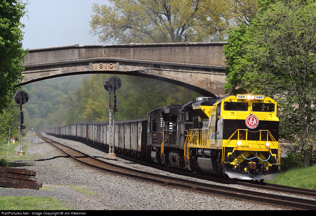 The Virginian Heritage Unit leads a coal train under the old concrete bridge at Port Royal, VA