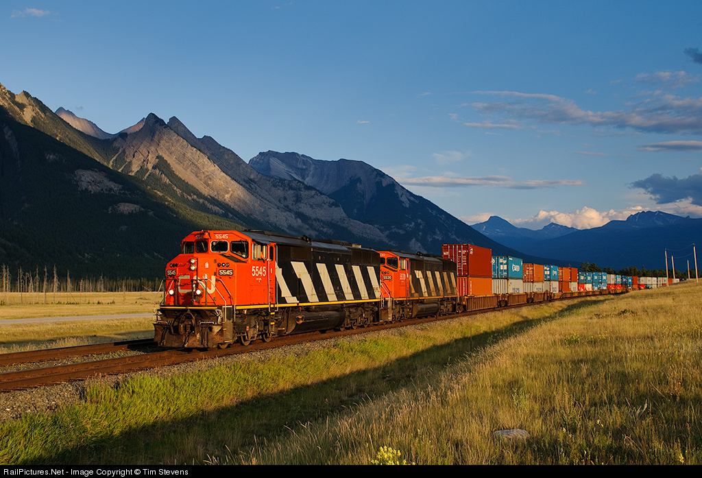 CN SD60Fs 5545 and 5530 speed towards the single track at Henry House with Prince Rupert-Montreal stack train Q192. Special thanks to whoever decided to wash the lead unit!