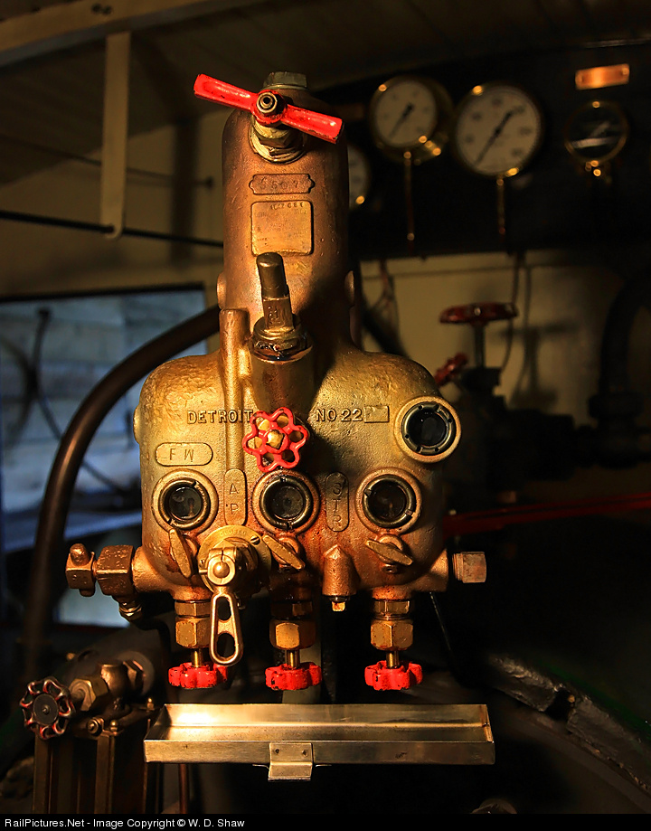 Number 2's trusty Detroit Lubricator basks in the warm glow of the train shed's lights - filled and ready for another day's service protecting the locomotive's vital parts from wear.