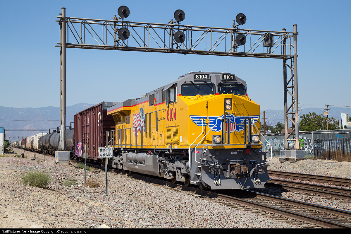 | Passing beneath a former ATSF signal bridge at Rana still outfitted with searchlight heads, a westbound Union Pacific freight with a lone ES44AH "Heavy" on the point is nearing its final destination at West Colton. |