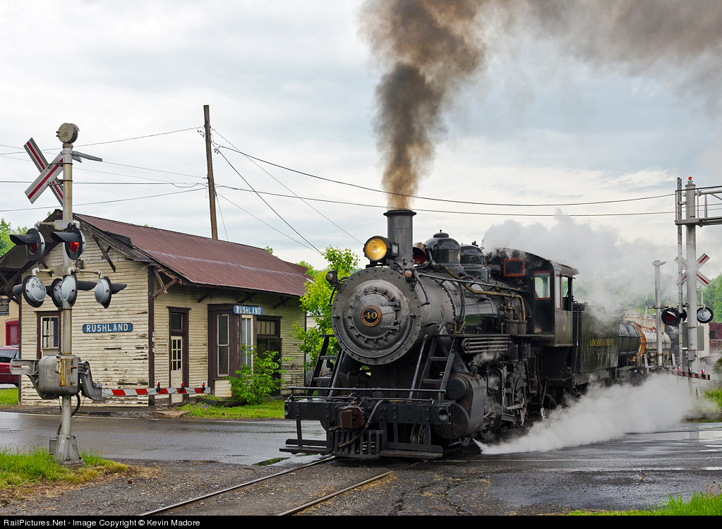 Rushin' through Rushland. The New Hope & Ivyland's Baldwin Consolidation #40 hits the grade crossing at Swamp Road in downtown Rushland, PA, passing the old Reading Company Depot, which is no longer in use. Although this spot still sees an occasional freight run, the New Hope's steam excursions seldom come this far south. The line's fall foliage trips are about the only time the 40 will venture this far from New Hope. The operation seen here was a special private photo charter, operated for Lerro Productions, Inc.
