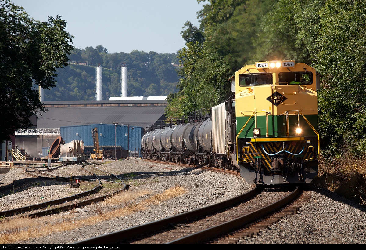 | Reading Heritage NS 1067 SD70ACe leads oil train 64X at Natrona Heights, passing Allegheny Ludlum's Brackenridge Plant. Their interplant railroad runs parallel to the Conemaugh Line for a few blocks between Brackenridge and Natrona. |