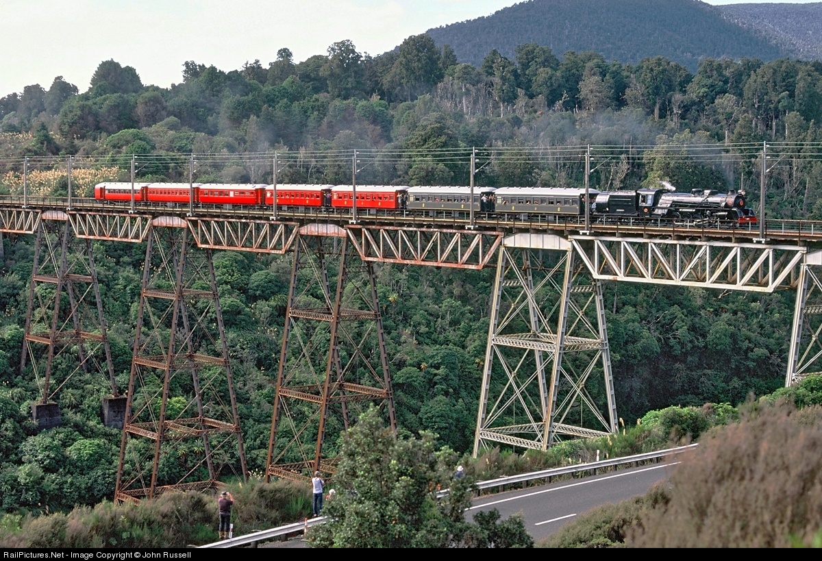 Steam Inc excursion Taumarunui to Ohakune and back allowed for rare photography in the spectacular section between National Park and Ohakune where the Trunk skirts the flanks of Mt. Ruapehu. There are several viaducts including Makatote, the highest at 78m (258 ft.) The train continued north to the Tauranga Jazz Festival.