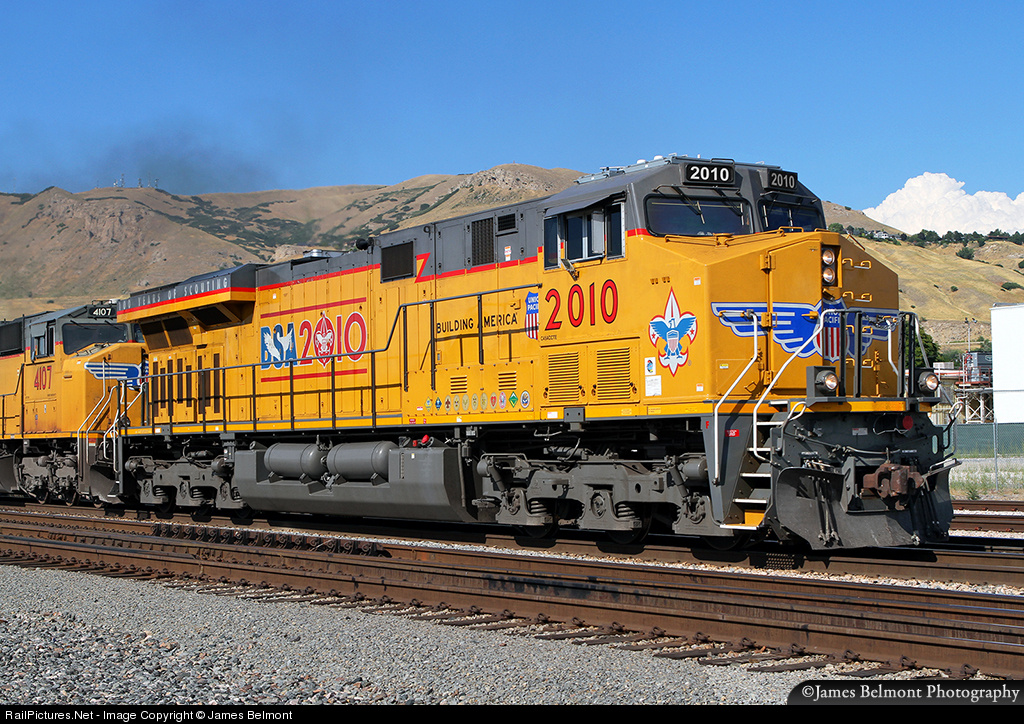 UP 2010 leads the MNPWC 17, departing Salt Lake City for West Colton on Aug. 18, 2013. This GE commemorates the 100th anniversary of the Boy Scouts of America. It was publicly debuted in Houston on March 31, 2010 and features the national Boy Scouts of America logo, the BSA's 100th Anniversary logo, the words "100 Years of Scouting" and