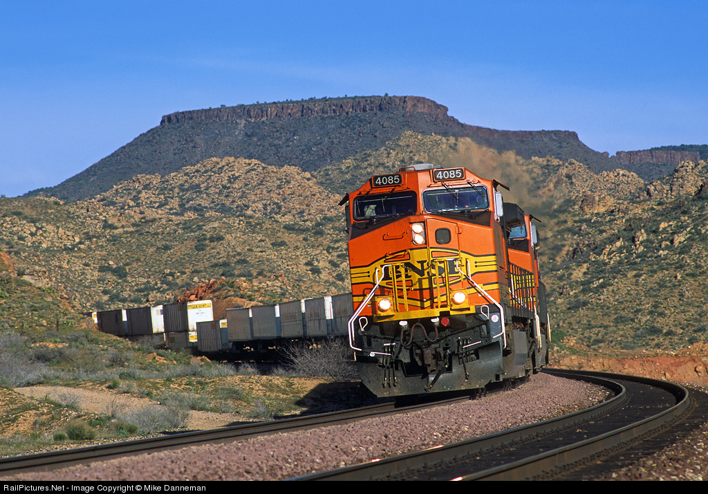 | A westbound BNSF intermodal train sails through the curve at Hackberry, Arizona, on March 16, 2005. |