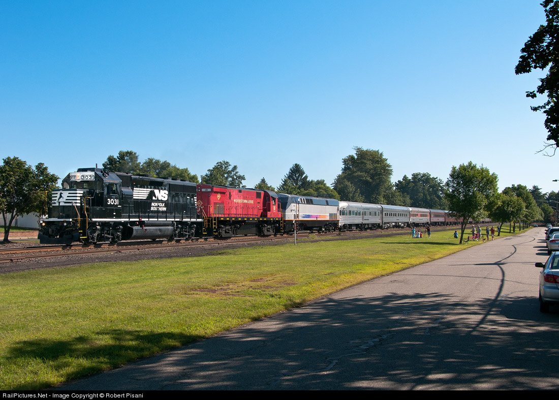 | The Lehigh Limited makes good time through Manville putting on a good show for the gathered railfans. This rare-mileage public excursion was operated to celebrate Morristown & Erie's 110th Anniversary. The trip originated in Hoboken on NJ Transit and operated over the NS Lehigh Line to Bethlehem, PA. The return trip was via the NS Washington Secondary and NJT's Morristown Line. Power includes NS 3031, M&E 18 and NJT 4802, which is providing HEP for the train. |