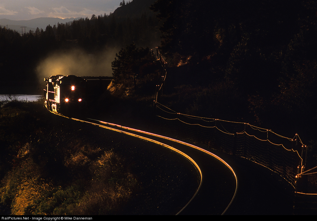 An eastbound grain train glints the evening’s sunset as the train snakes along the Clark Fork between Thompson Falls and Eddy, Montana, on September 22, 2006. Like a golden spider web, a slide fence along the main line guards against any falling rocks from the high cliffs above. The train is traveling Montana Rail Link’s highly scenic Fourth Subdivision.