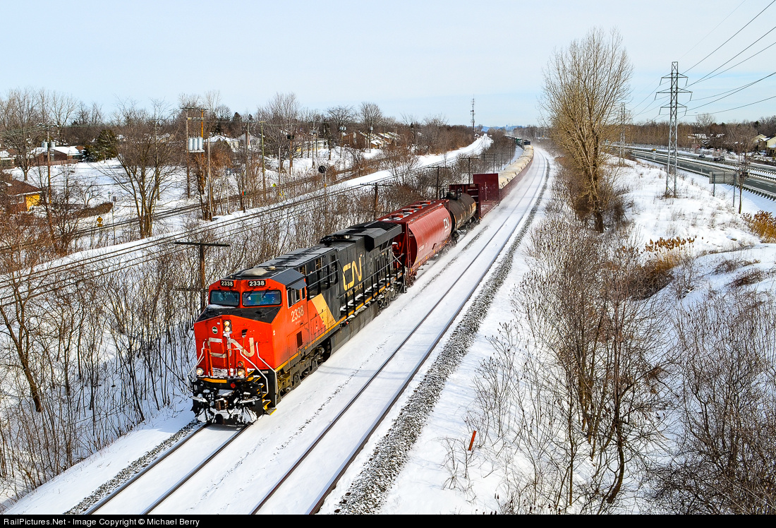 | CN 2338 leads a westbound through Beaconsfield, Quebec on a clear and crisp winter morning. This was taken from a pedestrian overpass that provides a good vantage point for trains passing on the parallel CN & CP main lines. For more train photos, check out http://www.railpictures.net/photos/mtlwestrailfan/. |