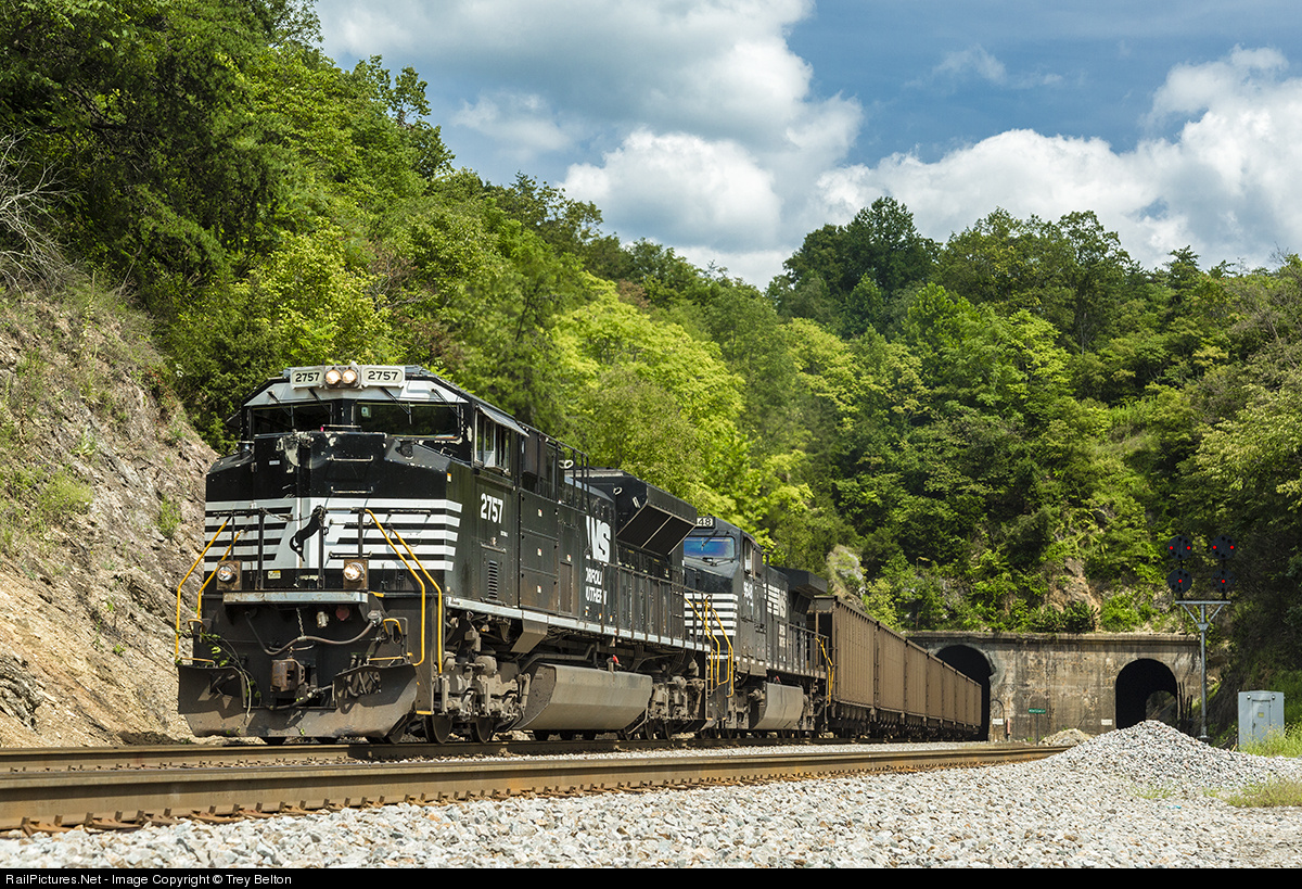 | The NS 2757 leads the 821 west through Montgomery Tunnel. It appears the front of the locomotive has hit a tree, as evident from the damage to the nose and the small limbs stuck in the plow.