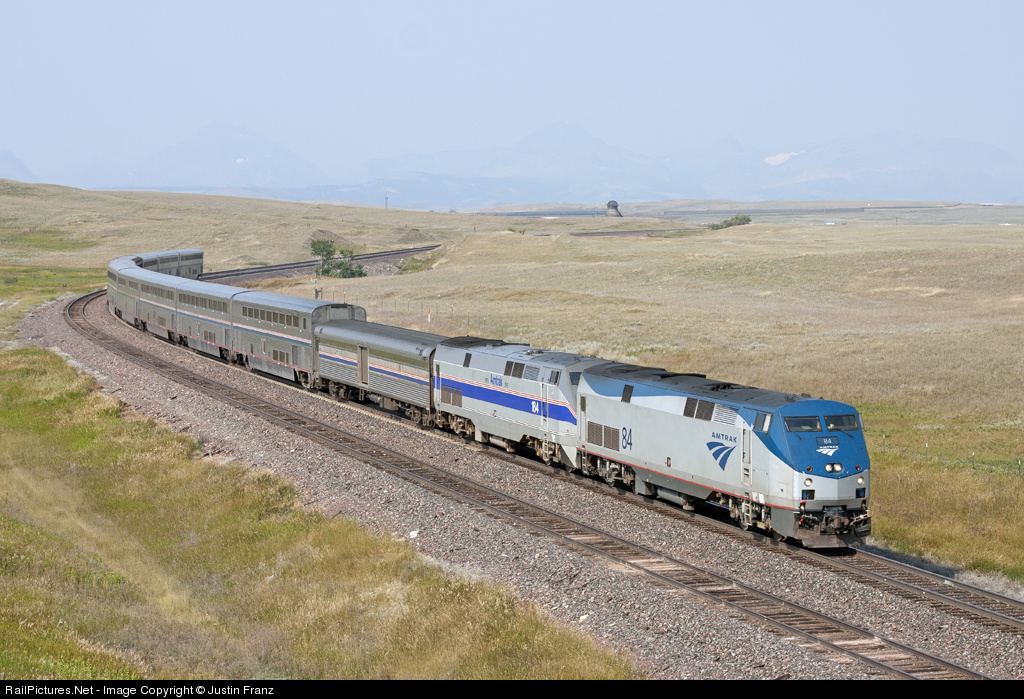 The Empire Builder: Amtrak's No. 8, the Empire Builder, rolls east through Browning, Mont. on Aug. 25, 2013. The second unit is No. 184, which sports Amtrak's Phase IV heritage scheme. Smoke from wildfires in western Montana obscures the Rocky Mountain front and Glacier National Park in the background.