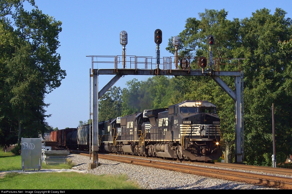 | With Southern signals falling fast I try to get as many pictures of them as possible before they are completely gone. Here NS M54 slowly creeps passed Belton to meet Amtrak 19 who is running over 2 hours late. |