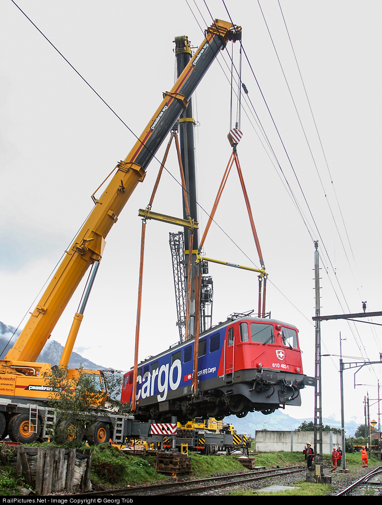 In sommer 2006, as a big surprise the then 42 years old Gotthard locomotive Ae 6/6 11492 "Emmen" was painted in the new red/blue Cargo paint scheme, got the new name "Erstfeld" and was placed on a highway rest stop, as an eye-catcher for the 125th anniversary of the Gotthard line. The 120 ton engine is seen lifted from the tracks by two mobile cranes in Altdorf station.