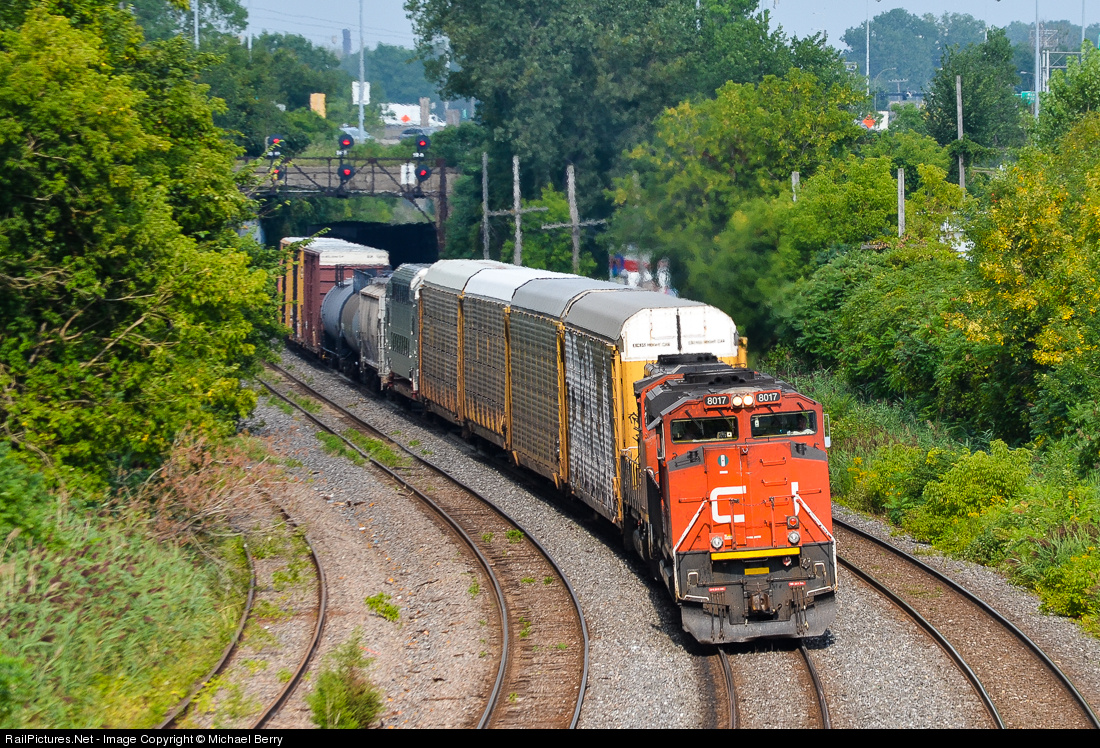 | CN 401 heads west through Montreal West, led by CN 8017 (missing part of its nose noodle) and CN 9450. Five cars back from the head end is a Bombardier Multilevel car destined for New Jersey Transit. It will be interchanged to CP at Montreal for furtherance to the Bombardier plant in Plattsburgh, NY. For more train photos, check out http://www.railpictures.net/photos/mtlwestrailfan/ |