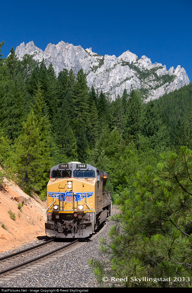 UP 7868 runs southbound on Union Pacific's Valley Subdivision, below Castle Crags, a 150-million year old granite pluton formation. The crags range from 2,000 to 6,500 feet above sea level.