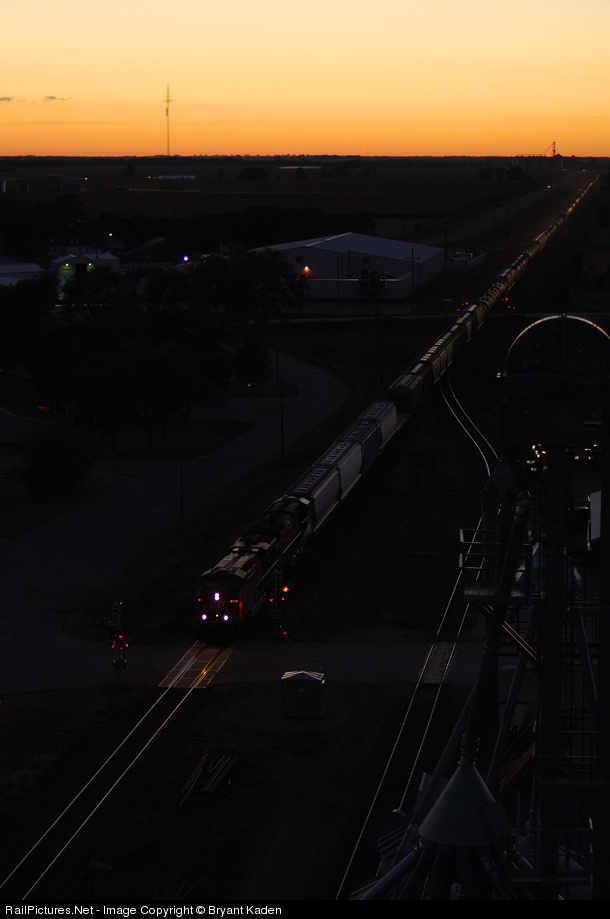 Sunset on the Minnesota prairie, seen from the top of the Belgrade Co-op elevator as an eastbound CP train rolls through town, slowing for a meet ahead.