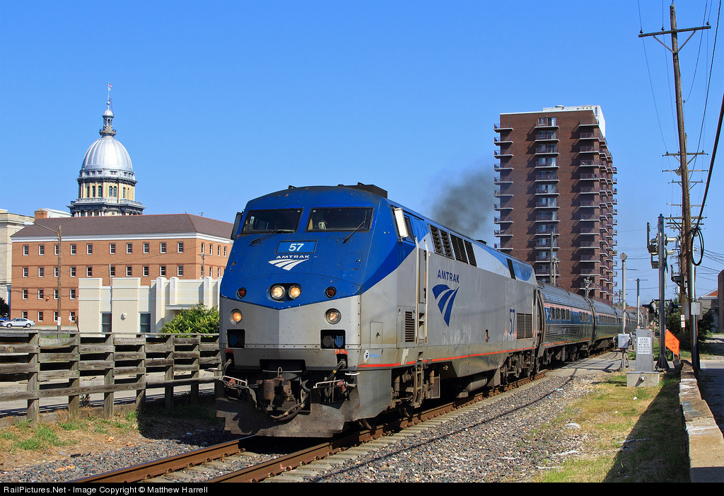 | Capitol Idea: Taking advantage of #302's station stop downtown, I was able to get ahead of the train for this nice, unobscured view of the train passing the Illinois State Capitol.