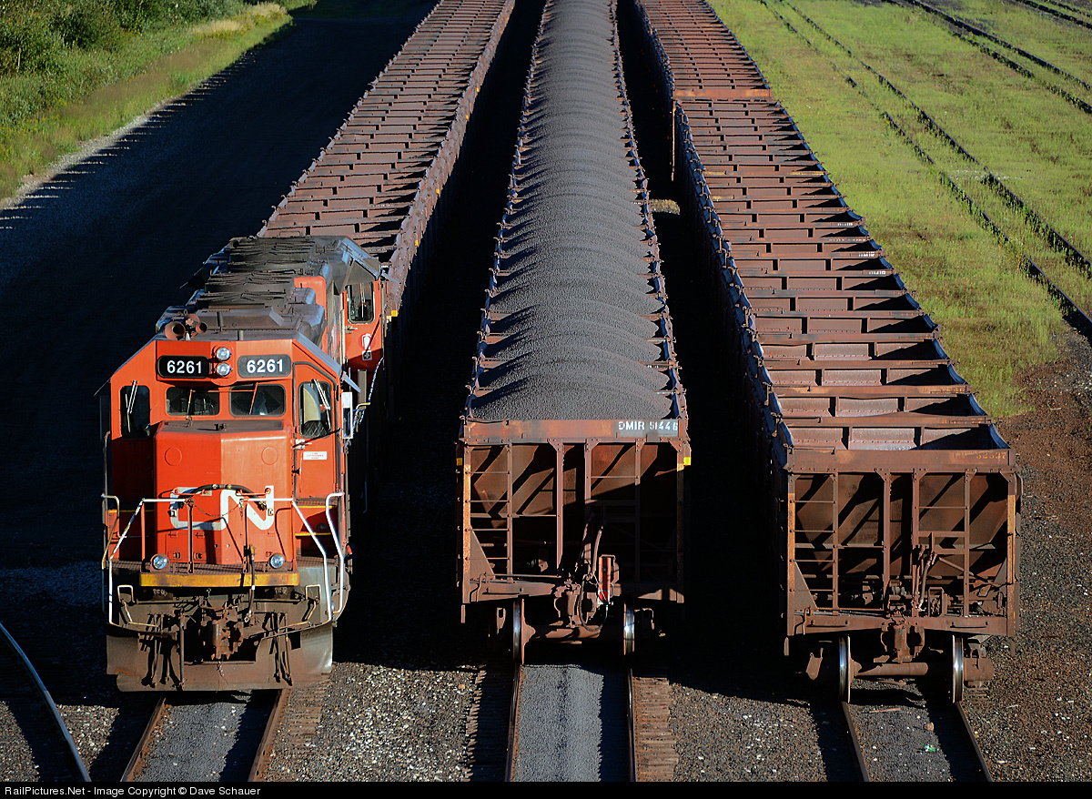 A pair of SD40s have brought an empty train up from the dock in Duluth.