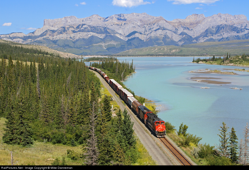 Canadian National train No. 417 passes Windy Point west of Devona, Alberta, on the afternoon of July 16, 2013. The glacial colors of Jasper Lake and mountains of Jasper National Park are in the background.