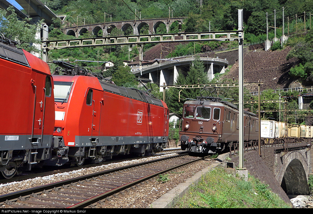 | BLS (Bern - Lötschberg - Simplon - Bahn) meets DB (Deutsche Bahn, BR 185) on the tracks of the SBB (Swiss Federal Railways) in the Biaschina between Lavorgo and Giornico on the imposing southpart of the Gotthardroute. At this part the trains climb in two spiraltunnels on the third level (in the background). In the corner left above two parts of the bridge from the highway |