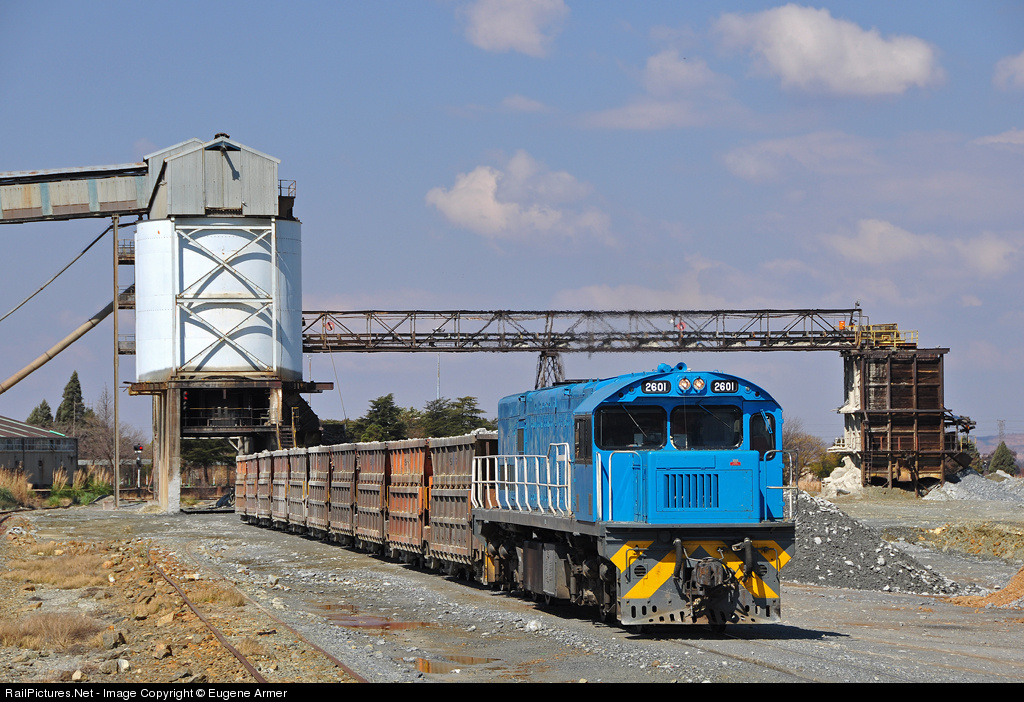 | In 2012 a batch of 30 diesel and three electric ex-Queensland Railways locomotives was imported into South Africa from Australia by three South African companies - AR&TS, RRL Grindrod and SAFLog. One of 7 class 2600 Goninan/GE U22C's (rebuilt as C22-MMi) that went to AR&TS, # 2601 has been leased to Sheltam to supplement their fleet on the Gold One system near Randfontein (previously Rand Uranium) and is seen here at Cooke 1 shaft. The loco was overhauled in the AR&TS Pretoria workshops and painted in their blue livery, but has not yet received the characteristic white striping and lettering. |