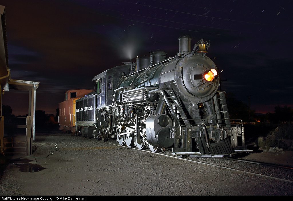 San Luis Central only owned one steam locomotive early in its history, a Baldwin 2-8-0 numbered 1, that was bought new in 1913 and retired in 1955. To celebrate the 100 year anniversary of the railroad, they operated a special passenger train on the 13-mile line from Monte Vista to Center in Colorado’s San Luis Valley. To help with celebrations, San Luis and Rio Grande relettered and renumbered their 2-8-0 No. 18, to SLC No. 1. On the evening of August 31, 2013, No. 1 simmers in front of the SLC yard office at Monte Vista, Colorado, waiting for the next day’s festivities.