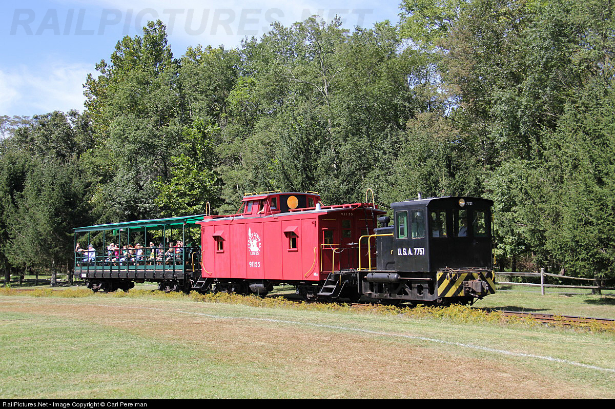 | During the Annual Railroaders' Weekend, ex US Army GE 25 ton 7751 pulls a re trucked former standard gauge CNJ wood caboose and an excursion flatcar. The train is operating around the Pine Creek Railroad's loop at Allaire State Park. |