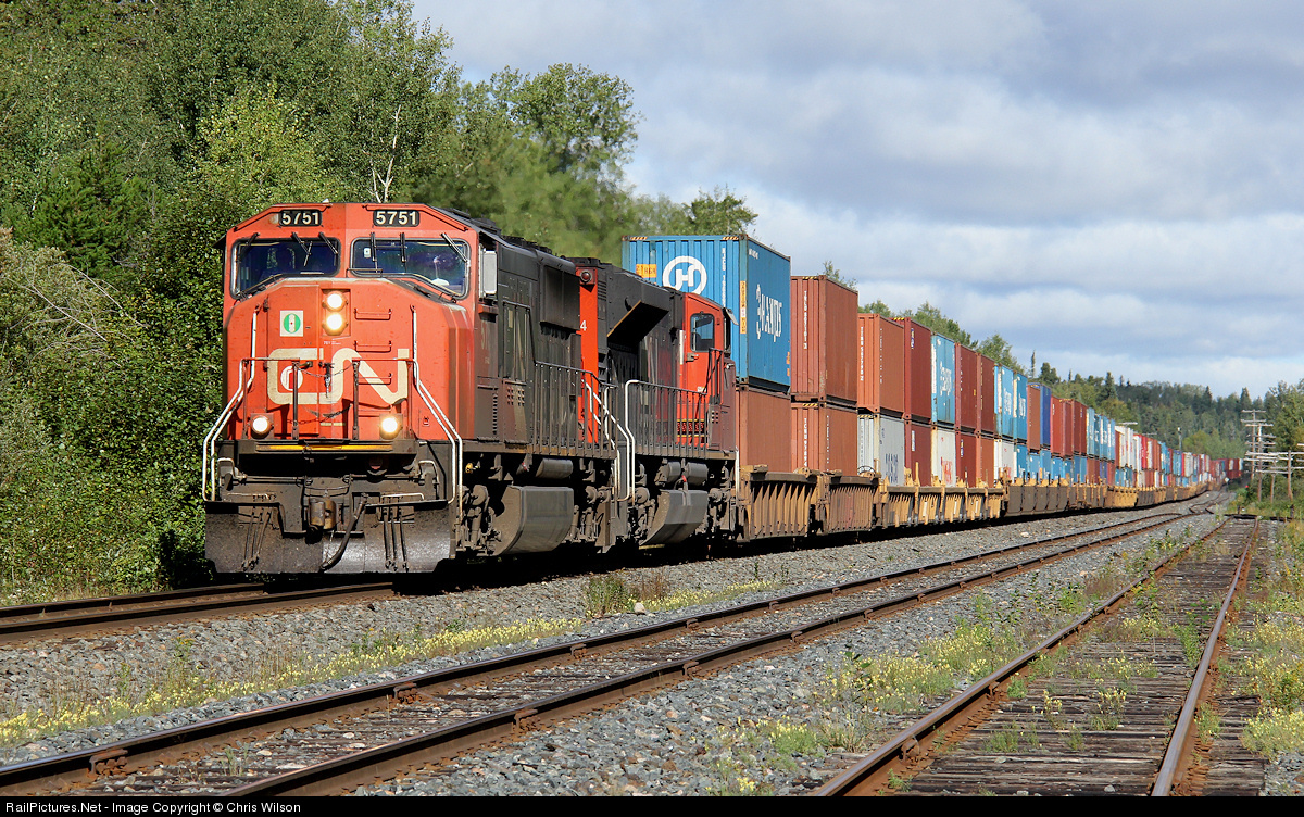 | CN 5751 + CN 8904 hustle Prince Rupert, BC - Montreal, PQ import stacks through Gogama; With 169 platforms, this is one land barge! |