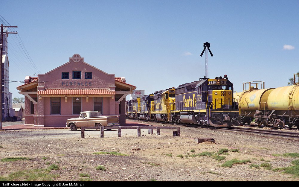A northbound potash train holds the main at Portales, New Mexico, while a southbound sulphur train waits in the siding. Portales was on Santa Fe's Carlsbad Subdivision 17 miles south of Clovis. The sulphur train is heading to Rustler Springs, Texas, for another load. The units on the potash train are 5628-4674-5011-5619 (SD45-2/SD26/SD40/SD45).