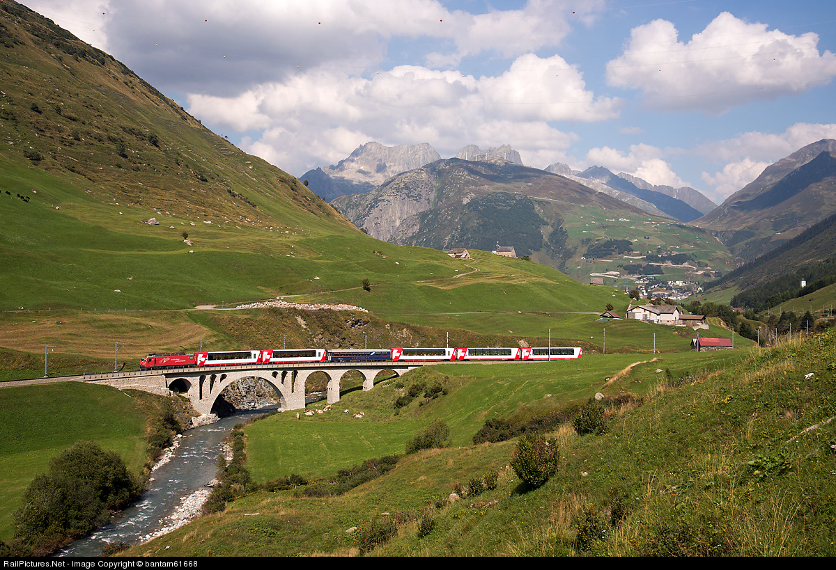 HGe4/4 ii 107 crosses the Richlerenbrücke shortly after passing through Hospental with a Zermatt bound Glacier Express service
