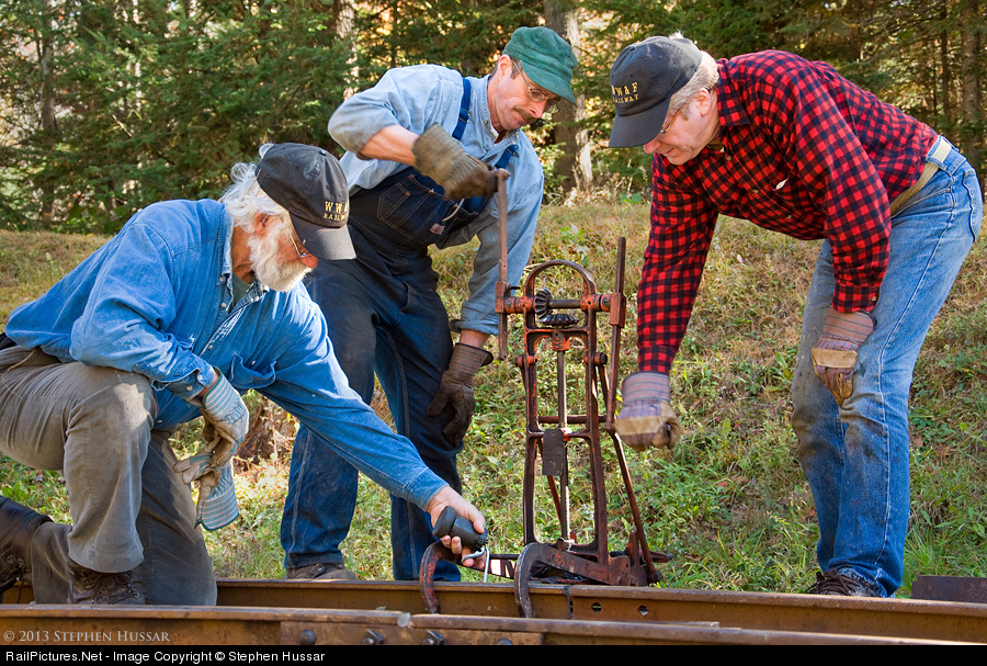 At the WW&F Railway Museum, the "old ways" of doing things are always preferred. Here, volunteers JB Smith, Dana Deering, and Stewart Rhine, work as a team to bore a 3/4" hole using a manual Armstrong rail drill. It will take 5-7 minutes to drill through this section of 60 lb steel rail, however time is of little concern here. The point is to experience something rarely seen by the general public. So next time someone asks you how many volunteers does it take to drill a hole in a length of rail, you can tell them...three! The museum's Fall Work Weekend is coming right up, October 11th thru 14th, 2013. www.wwfry.org