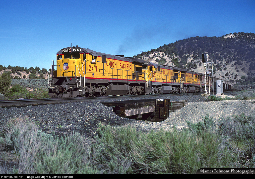 The Union Pacific provided Rio Grande engineer Ed Jones and conductor Neal Thorpe a quartet of GE C30-7s to haul an Intermountain Power coal empty east out of Provo Yard on June 4, 1988. At the time they must have wondered what they had done to deserve it! Regardless of the all GE power lashup, D&RGW train 734 crosses the dry creek bed of Mill Fork headed east to Skyline.