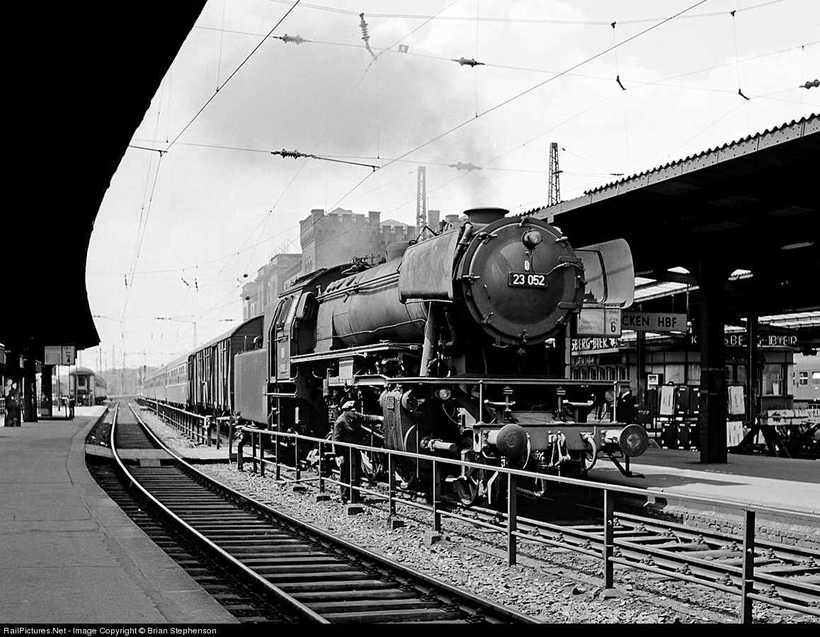 Post-war DB 2-6-2 No 23 052 waits to leave Saarbrucken Hbf with train E131, the 13.18 Eilzug to Karlsruhe where it became D131 behind an electric loco. It had previously changed to diesel power in the form of V160 017 at Landau (Pfalz) where the train reversed.