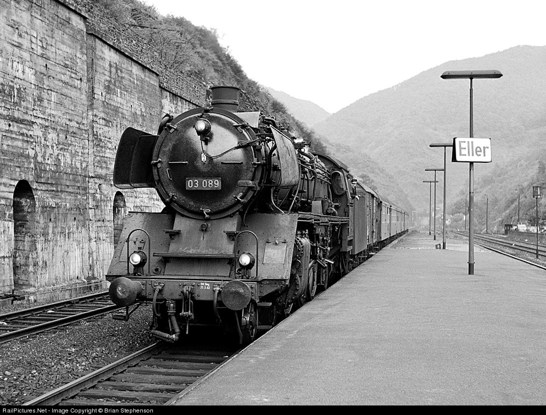 DB 4-6-2 No 03 089 arrives at Eller with train P2450, the 14.25 Koblenz to Trier personenzug (stopping passenger train). In the far distance the Kaiser Willhelm tunnel portal can be seen. This was the longest railway tunnel in Germany until surpassed by a new tunnel on a high speed line. In the past three years or so a second tunnel has been constructed from Eller to Cochem to enable the old tunnel to be repaired and brought up to modern safety standards.