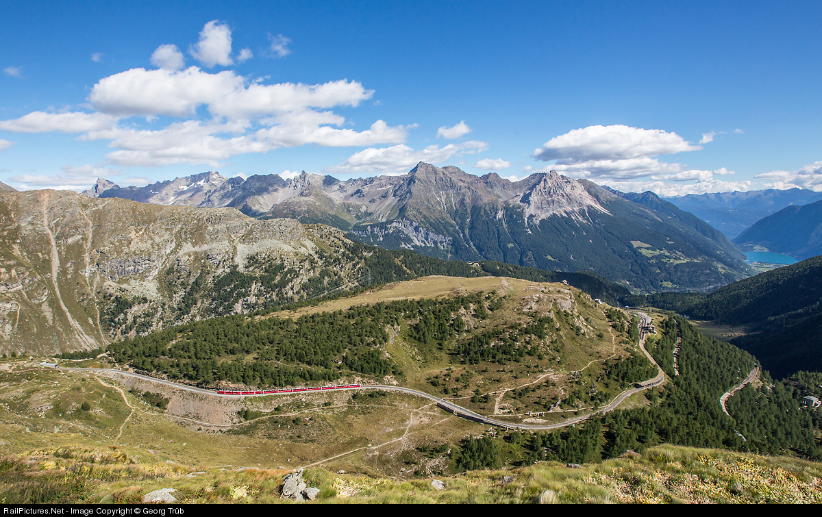 On this beautiful and clear autumn day, "Allegra" ABe 8/12 with 7 panoramic car is forming train 950 "Bernina Express" from Tirano to Chur and is on the way from Alp Grüm to Ospizio Bernina, viewed from the Sassal Masone mountain restaurant. On the right Alp Grüm and Lake Poschiavo, in the background the Bergamasque mountain range in Italy.