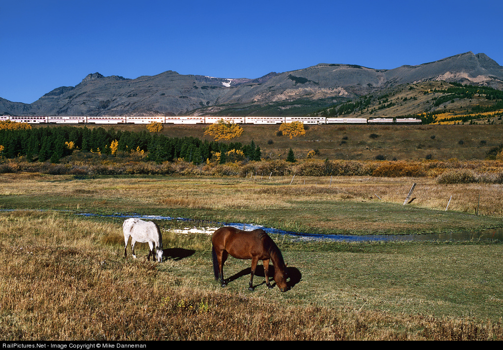 Amtrak’s Empire Builder approaches the summit of Marias Pass east of Bison, Montana, on October 9, 1996. Morning sun glints brightly off the sides of stainless steel Superliner cars as the train passes over a large curved fill, while a pair of horses contently graze the morning away in the foreground.