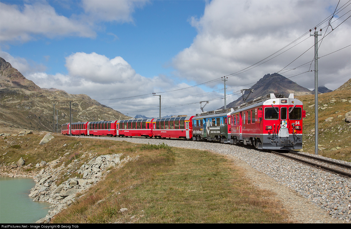 | Electric railcars ABe 4/4 # 54 and 53 (this with publicity paint scheme Credito Valtelinese) are pulling train 973 from St.Moritz to Tirano along Lago Bianco between Lagalb and Ospizio Bernina.