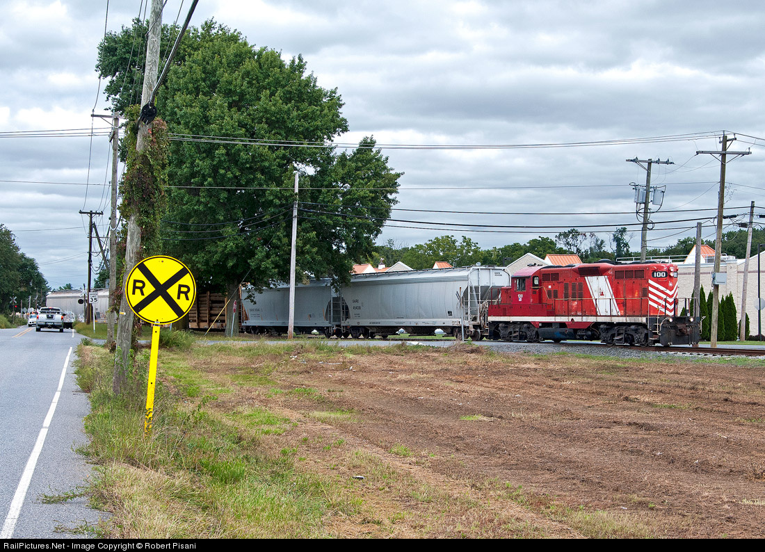 | SRNJ's three-day-a-week turn from Salem to Swedesboro has completed interchange with Conrail and heads south out of town under threatening skies. Aside from the lowered short hood, SRNJ 100 is a mostly original GP9 and is still in service without a major rebuilding. This unit is ex-C&O 6099 (built 7/56) and came to the SRNJ via the Huron & Eastern. |