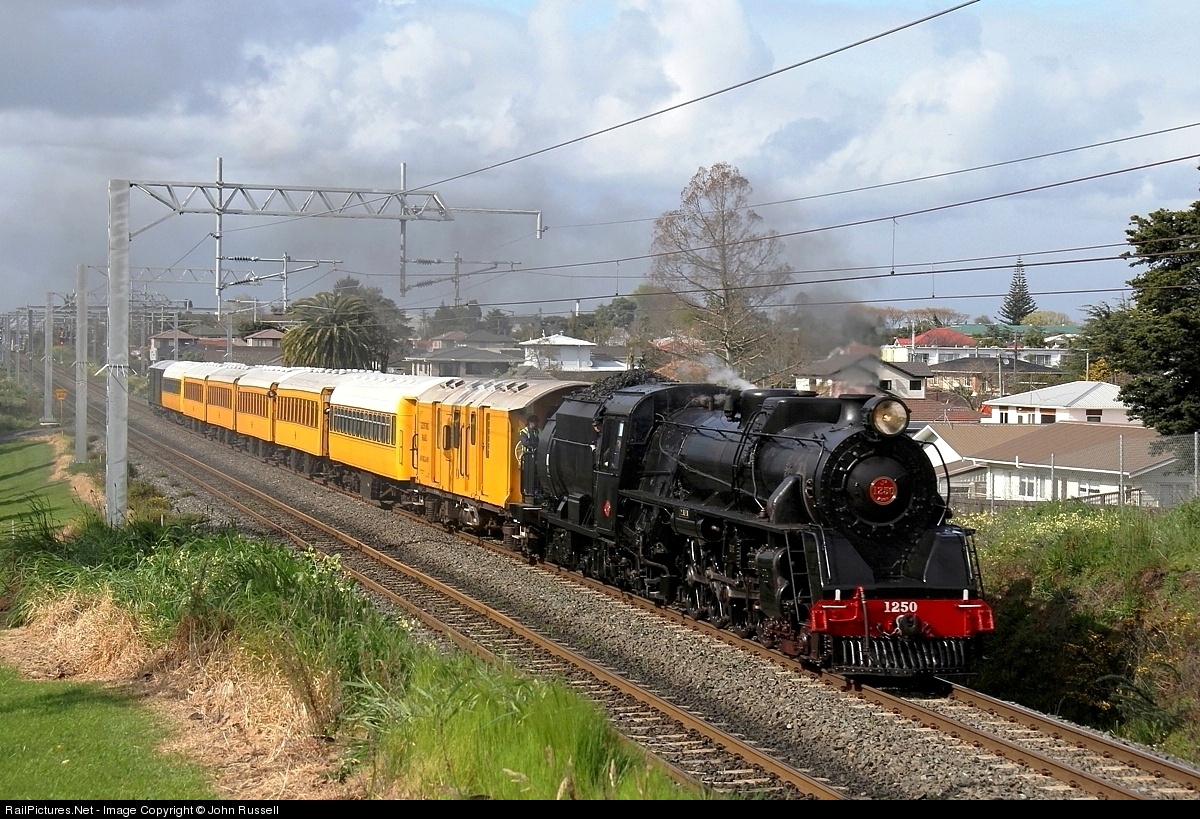 Ja 1250 heads a Railway Enthusiasts Society excursion to Helensville, seen near Papatoetoe in Auckland's southern suburbs. The locomotive was built at Hillside, Dunedin in the 1950s and was among the last steam engines built for New Zealand rails.)