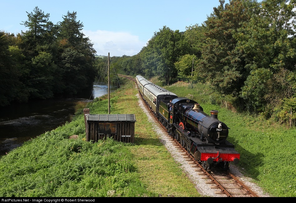 | 7827 Lydham Manor, visiting the South Devon Railway for a short period, drifts past Hood Bridge hauling the 14:15 Buckfastleigh to Totnes on Monday 16th September 2013 |