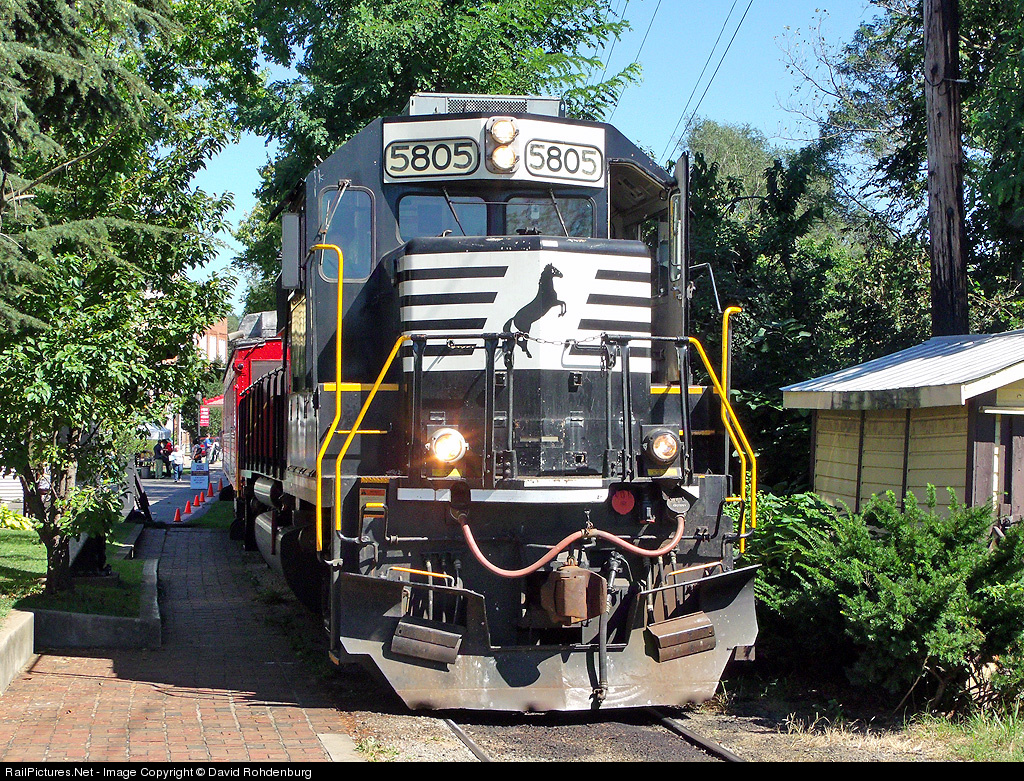 Class Act by a Class 1: It's not everyday that you will find Class 1 freight locomotives on a passenger train, much less on a tourist train! However, for the two weekend annual visit of Thomas the Tank Engine to the Lebanon, Mason & Monroe Railroad in Lebanon, Norfolk Southern generously provided the use of GP38-3 rebuild NS 5805 to provide the motive power for the trips, giving the LM&M's regular unit, GP7 55, a much needed break, and showing how much of a class act they really are. In this view, we are on the platform at the depot in Lebanon as NS 5805 throttles up to depart town with the final trip of the day. Thomas is on the other end of the train, and will lead on the return trip. Special thanks to Norfolk Southern Corp. and the Lebanon, Mason & Monroe Railroad for making the dreams of so many children come true!